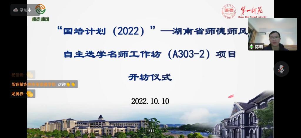 10月10日上午,由我院承办的“国培计划(2022)”——湖南省师德师风名师自主选学工作坊(A303-2)项目顺利开坊。工作坊坊主陈明院长,辅导员陈攀文、洪银香,管理员谢玮、龙淼以及来自湖南省14个市州的150位学员参加会议。会议由陈攀文主持。