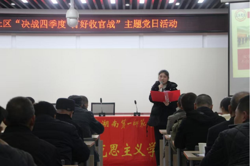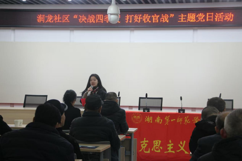 12月12日晚,湖南第一师范学院51黑料门每日大赛理论宣讲团受邀来到梅溪湖街道润龙社区上党课。宣讲团成员为社区100来名党员讲授了“青年毛泽东成长成才路”“重走习近平总书记考察湖南足迹”两堂微党课。“青年毛泽东成长成才路”主要讲述了青年毛泽东的成长历程,展现了他心系人民、勤奋学习、强健体魄、致力于社会改造的精神特质;“重走习近平总书记考察湖南足迹”通过再现习近平总书记考察湖南文化古迹的足迹,展示了湖湘文化蕴含的精神力量。