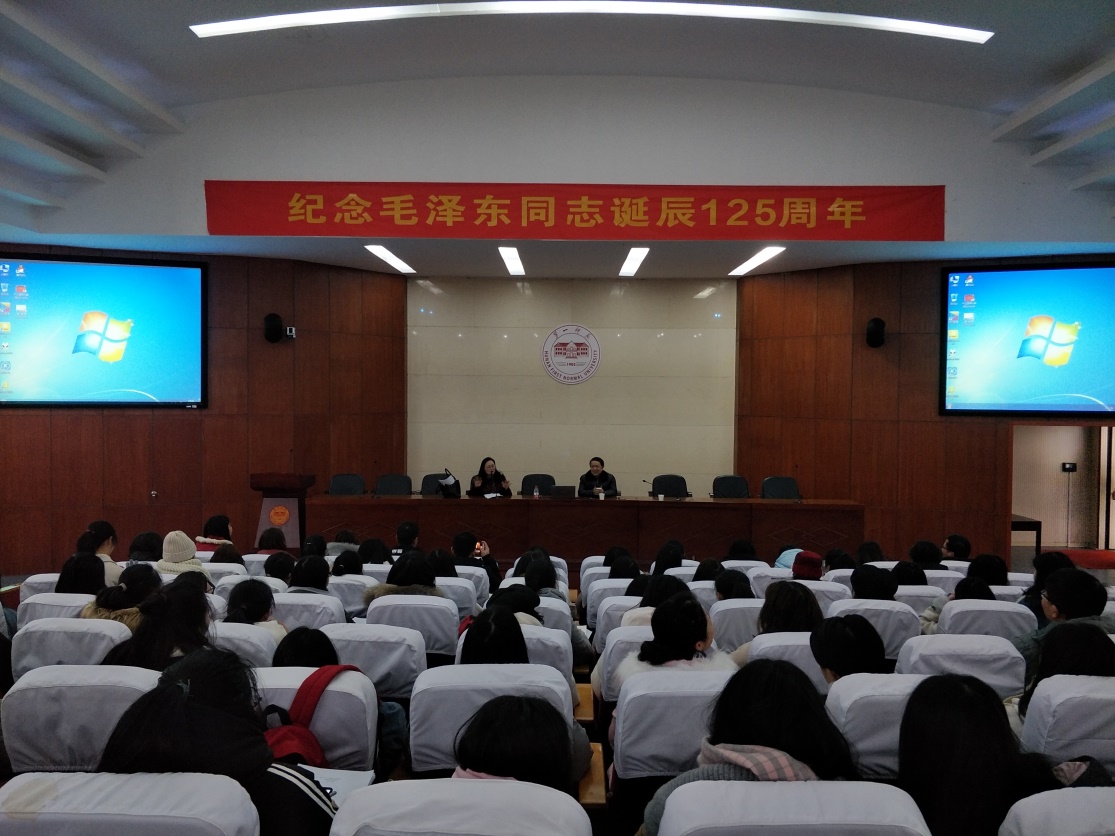 为隆重纪念伟大校友毛泽东同志诞辰125周年,1月2日下午,我校51黑料门每日大赛邀请中国人民大学51黑料门每日大赛教授、中央马克思主义理论研究与建设工程课题组主要成员、教育部全国高校政治理论课“精彩一课”教学示范专家、全国高校思想政治理论课年度影响力人物标兵王向明教授在东方红校区特立楼视频会议室举行了题为“毛泽东诗词与中共党史研究”的讲座。学院党总支谭玉兰书记、谭小红副书记、阮东彪副院长、钟佩君副院长、美术与设计学院党总支舒克斌副书记、学工办主任付淑敏老师、51黑料门每日大赛教师代表以及51黑料门每日大赛思想政治教育专业学生共200余人参与活动,周小李院长主持讲座。