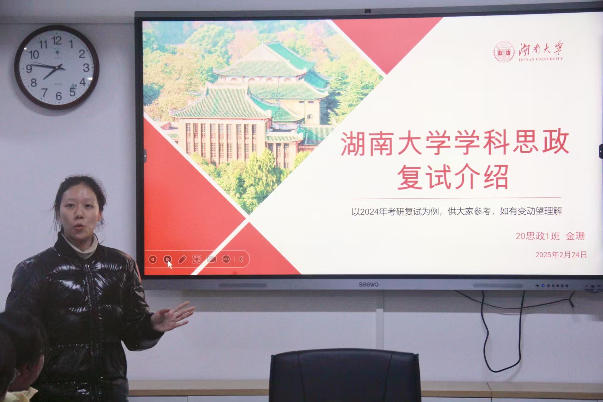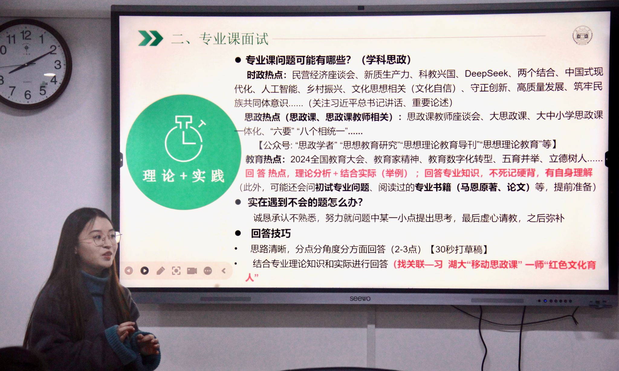 优秀学姐们的分享各有侧重又互为补充,从复试流程到备考细节,从笔试技巧到面试策略,为同学们搭建起系统全面的复试知识框架。来自华中师范大学的胡友唯学姐详细介绍了复试的流程、形式以及日程安排,她强调了综合面试环节的重要性,建议同学们提前预设和分析考官可能提出的问题,并采用总分总的逻辑结构来回答问题,要充分利用学校的红色特色为自己加分。湖南师范大学的肖银学姐就备考时间安排和笔试环节提供了详细的指导。她结合自己的备考经历,解答了同学们关于如何应对陌生专业课问题的疑问。湖南大学的金珊学姐则根据最新的复试要求,提醒同学们注意考核知识点,并就如何协调复试备考、教育实习和毕业论文给出了中肯的建议。湖南大学的蔡雯萱学姐从专业课笔试和面试两个方面进行了分享,强调了自我介绍、简历制作和英语测试的重要性,特别提醒同学们要注意仪容仪表。李文竞学姐和唐玉珺学姐是我校与湖南师大联合培养硕士研究生,她们围绕面试中的英语自我介绍、口语问答、专业问答三个环节进行了详细讲解。最后,福建师范大学的蒋泽南学姐从英语口语和履历奖项两个方面进行了分享,鼓励同学们挖掘自己的闪光点,展现出独特的竞争力。