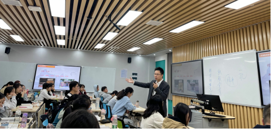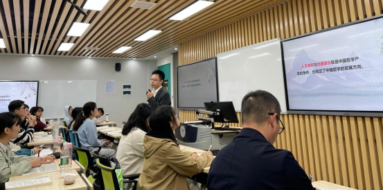 谭凯老师本讲的专题为:中国哲学及其特点,主要探讨了三个问题:一是厘清“哲学”与中国哲学这两个基本概念及核心要义,二是分析中国哲学产生的两大历史条件,即人文关怀与忧患意识,三是精妙总结了中国哲学的五个特点,包括偏重伦理本位,注重天人合一,重人生不重知论,重了悟不重论证,不依附宗教也不依附科学等。讲授过程中,谭凯老师充分运用了中西比较、实例论证、故事穿插以及史料分享等多种教学方法,深入浅出地将中国哲学的缘起、精义与特点讲的清楚明白,体现了深厚的知识功底与精湛的教学技艺,学生听的津津有味,频频点头,不时随着谭老师的提问而即兴发言,整个课堂生气盎然,精彩纷呈。