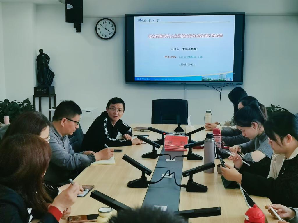 黄秋生教授以《马克思的伟大人生及对大学生成长成才的启示》为主题,通过习近平总书记在纪念马克思诞辰200周年大会上的讲话为切入点,围绕“马克思的伟大人生”“马克思的巨大贡献”“马克思的成长成才启示”等三个方面进行了深入解读。黄教授从马克思的“出生求学”“革命工作”“婚姻家庭”“伟大友谊”“巨大贡献”这五个方面,用形象生动的语言为师生展现了马克思作为顶天立地的伟人,有血有肉的常人的一生。黄教授结合马克思主义诞生的过程,总结概括了马克思给我们人类做出的伟大贡献,创立了历史唯物主义和剩余价值理论,揭示了人类社会发展的基本规律,揭示了资本主义剥削工人的秘密,为人类的解放指明了方向,深刻地影响了人类发展的走向和进程。最后,黄教授从“志存高远”“勤奋好学”“贵在坚持”等三个方面总结概括了马克思的伟大人生对当代大学生成长成才的重要启示意义。