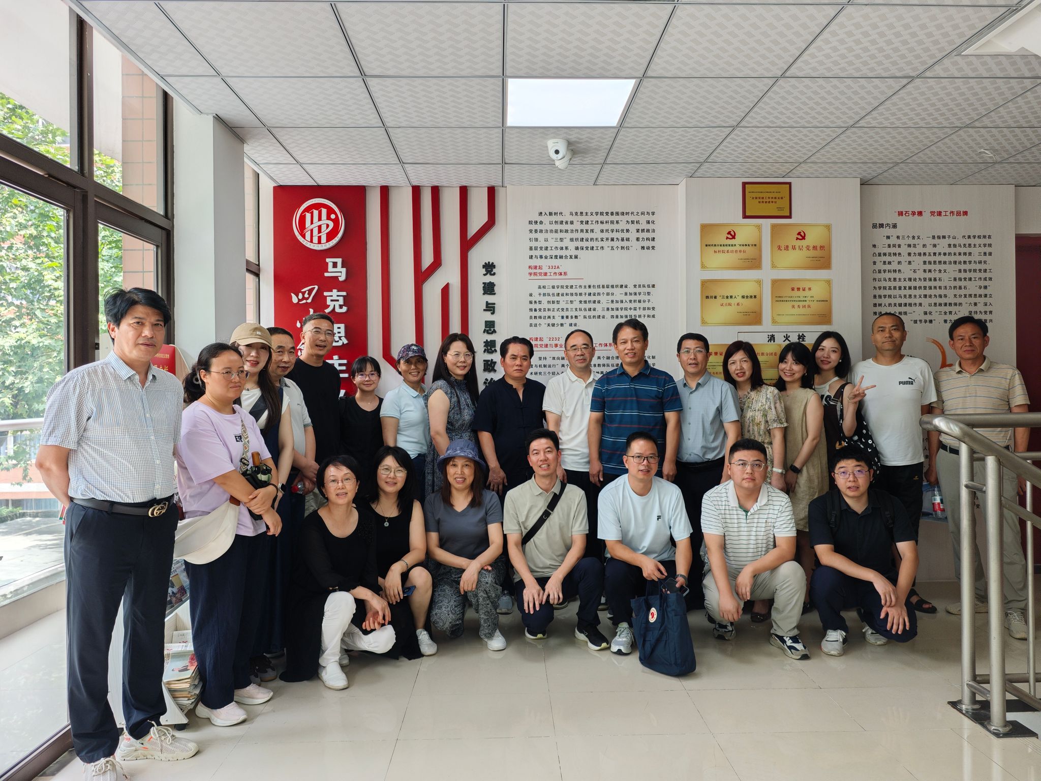 讲座结束后,参训教师集中参观了川师大党建文化墙,胡尚峰重点介绍了川师大马院“狮石孕穗”党建工作品牌,以及党建引领下的教师工作子品牌“狮石孕穗·明德馨师”、学生工作子品牌“狮石孕穗·至诚青马”,通过品牌化建设,构建起“3333“全面从严治党工作体系,切实提升了基层党建工作的凝聚力、引领力,增强了思政课的育人实效,赢得了参训教师的一致好评。