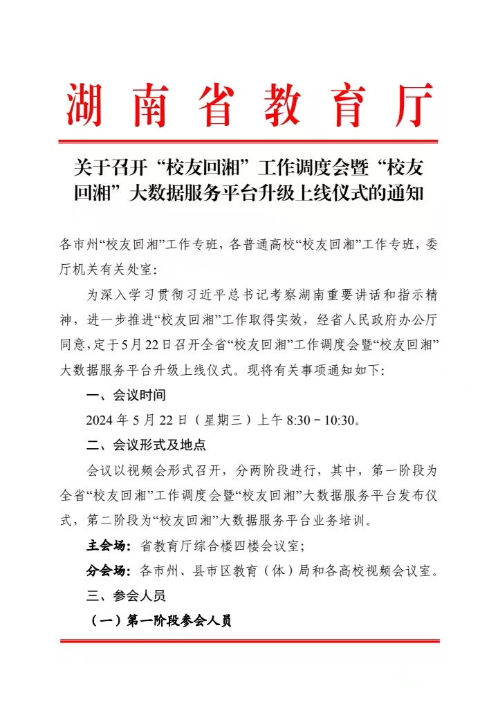 关于召开“校友回湘”工作调度会暨“校友回湘”大数据服务平台升级上线仪式的通知