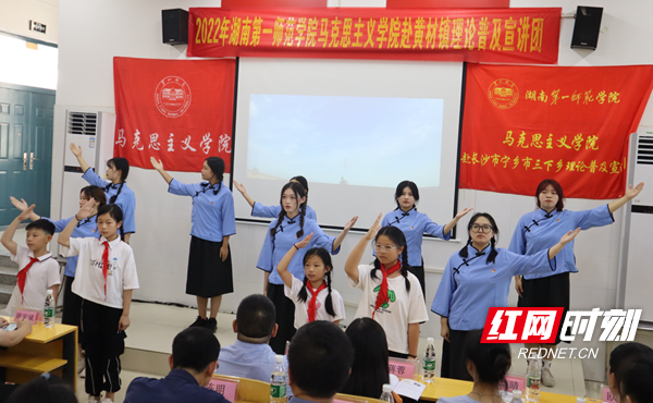 舞台上的小老师来自湖南第一师范学院赴宁乡市推广普通话助力乡村振兴服务队,舞台上的学生是黄材镇中心小学参加该校三下乡“星火”夏令营的孩子们,这是小老师和孩子们第一次携手登上朗诵舞台。