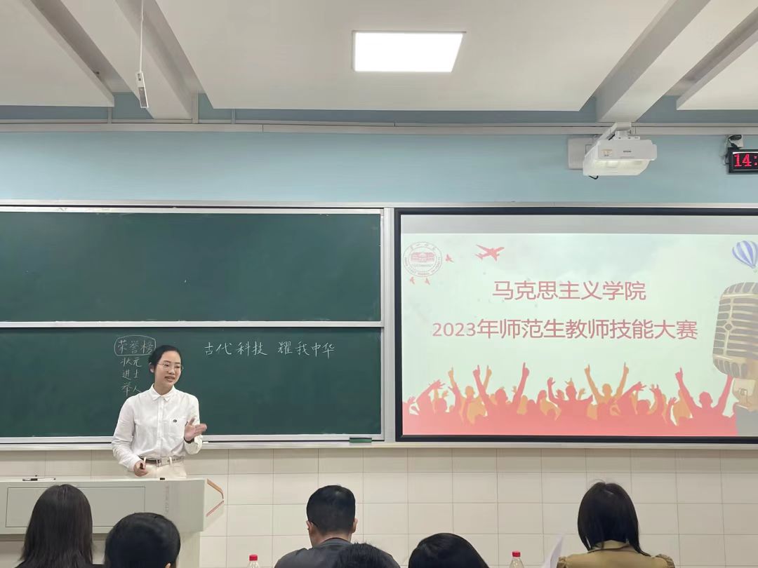 为深入贯彻落实党的二十大精神,积极响应湖南省教育厅主办的“湖南省普通高等学校师范生教学技能竞赛”活动,进一步强化我院学生的教师职业技能,提升立德树人本领,4月21日下午,我院在怀中南102教室开展师范生教学技能竞赛复赛。本次比赛邀请学院王竹苗副院长、杨秀云老师、李红雁老师担任评委,数十名马院同学自发到现场观摩学习。
