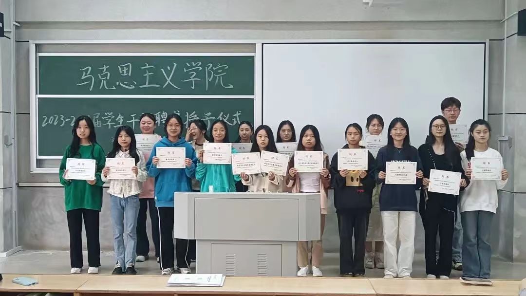 接着,受聘仪式正式开始,由杨荣为新一届学生干部颁发聘书,同学们按照党支部、分团委、学生会的顺序依次上台接受聘书,并合影留念。