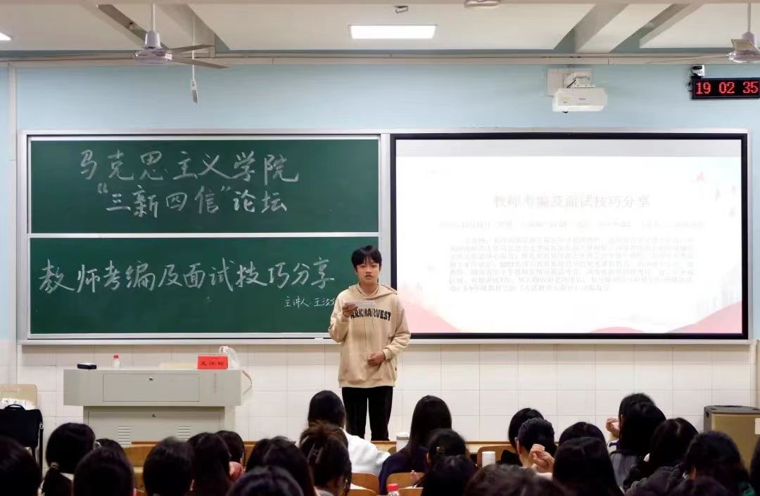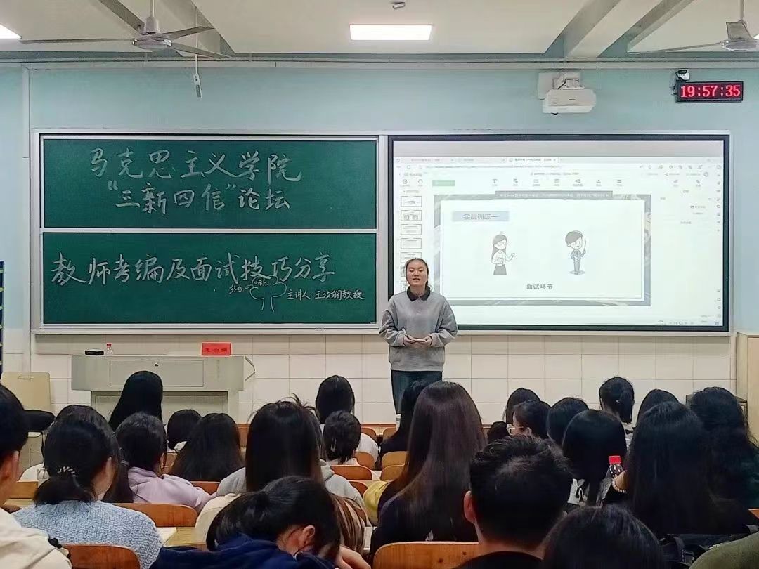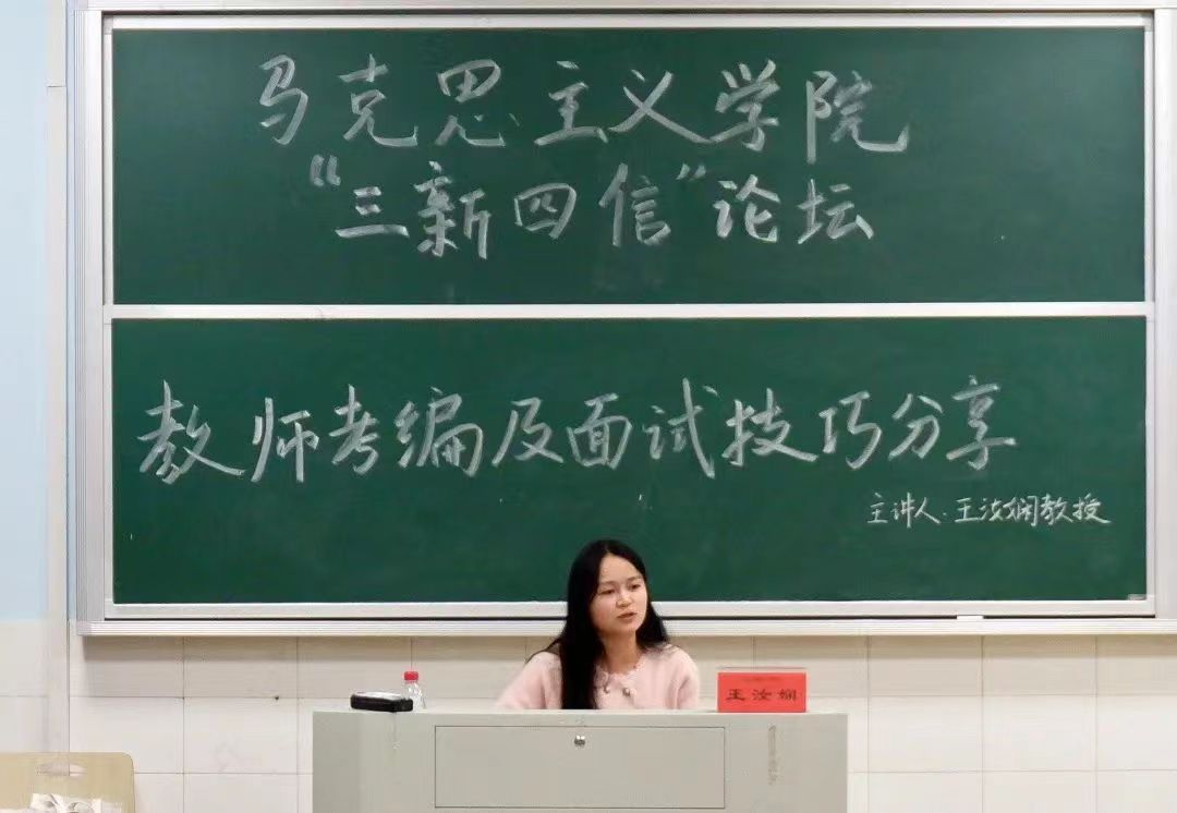 11月22日晚,我院在怀中南102教室顺利举行了“三新四信”论坛讲座。此次讲座以“凝心铸魂育新人 筑梦前行赴新篇”为主题,由王汝娴老师主讲,主要分享教师考编及面试等各方面经验。我院21级、22级思想政治教育专业学生在场聆听了此次讲座。