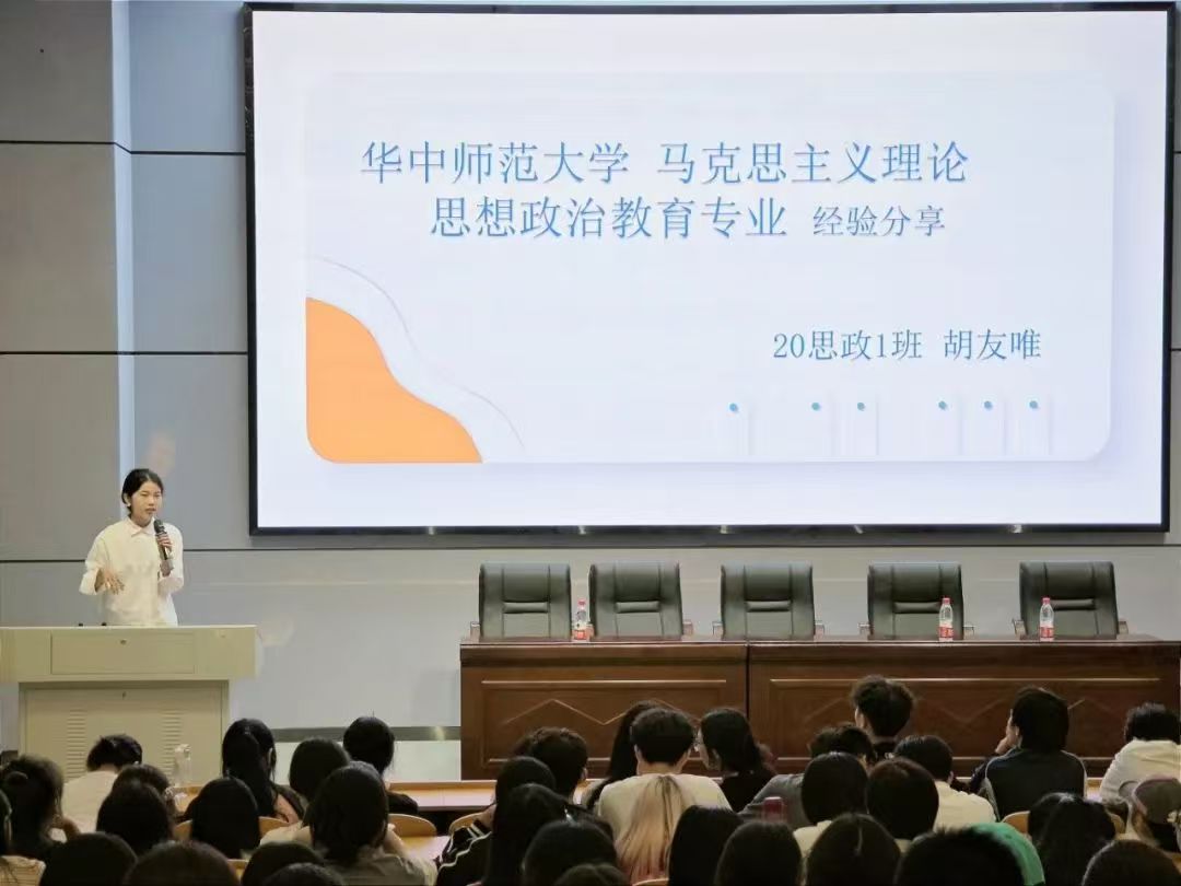 在经验分享环节,2020级优秀考研学生代表蔡雯萱、张嘉怡、朱珊、胡友唯依次为同学们分享她们的考研历程、心得体会和学习方法。