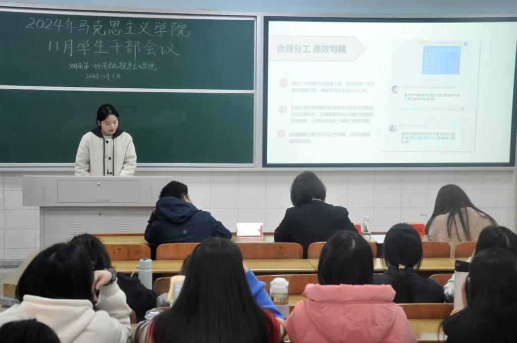 会议伊始,宣传部负责人杨优璇和学习部负责人侯欣雨分别上台分享了部门工作经验。杨优璇以制作一篇推文为例,详细阐述了宣传部各分部门的任务分工,并从创意亮点、团队协作、未来发展规划三个方面全面介绍了宣传部的工作。她表示,未来将专注于提升团队的专业素养和协作能力。侯欣雨对学习部的重点工作进行了总结,强调了常规工作的重要性以及信息反馈的必要性。她又带领大家一同回顾了学习部组织开展的特色活动,并指出反思总结是吸取经验教训、提高工作效率的好办法。
