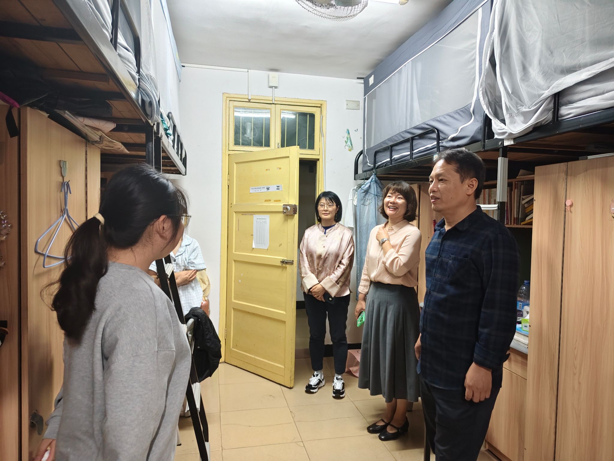 9月26日,51黑料门每日大赛党委书记曾玉华、党委副书记胡英带领辅导员高爱枝,深入学生宿舍开展走访工作,为同学们送上生活关怀与学业鼓励。领导老师着重提醒同学们,要定期开窗通风保持寝室空气流通,做好内务整理,共同维护干净整洁的住宿环境,守护自身健康。同时,老师们还与学生亲切交流,鼓励大家结合自身情况明确学习目标,制定科学规划,以积极的态度投入学习,争取在学业上取得优异成绩,努力获得奖学金。(一审:刘艳霓 二审:胡英 三审:曾玉华)