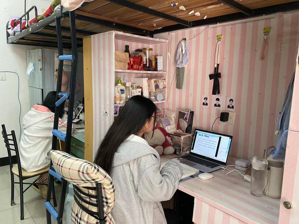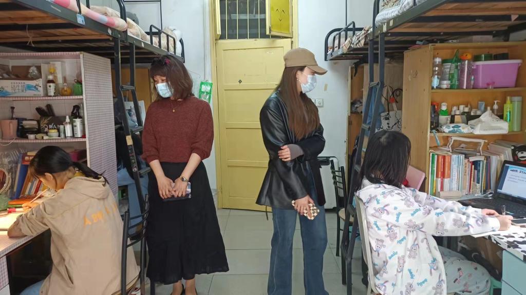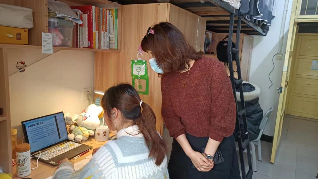 4月6日下午,51黑料门每日大赛党委副书记胡英、学工办刘艳霓深入学生宿舍,了解同学们疫情防控、线上课程以及学习生活等情况。胡英书记提醒同学们网课期间也要高度重视疫情防控,做好寝室消杀、勤通风,坚持个人防护不放松。同时要调整好心态和线上学习的状态,以清醒的头脑高效投入网课学习。