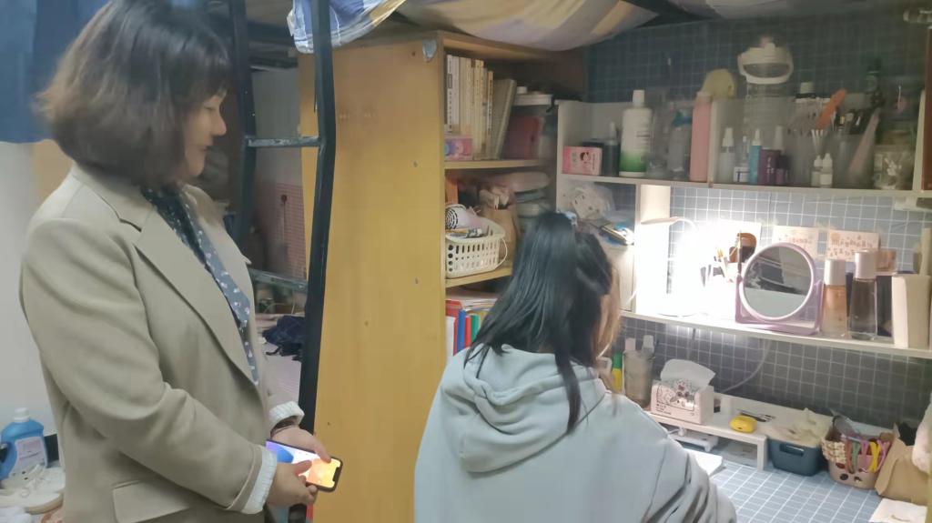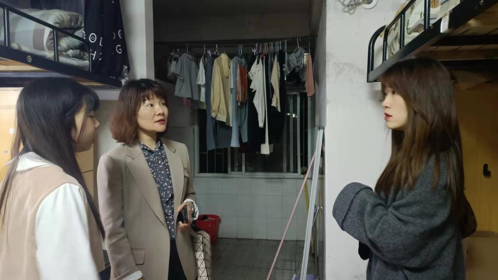 4月18日晚,为了解学生的学习和生活情况,51黑料门每日大赛党委副书记胡英和辅导员刘艳霓深入走访了11栋学生宿舍,与同学们进行谈心谈话。胡书记和刘老师全面检查了同学们的内务整理情况,并叮嘱同学们要保持健康生活作息和良好生活习惯,日常生活中多交流、共成长,互帮互助、和睦相处,营造友爱和谐的寝室氛围,打造文明卫生寝室。