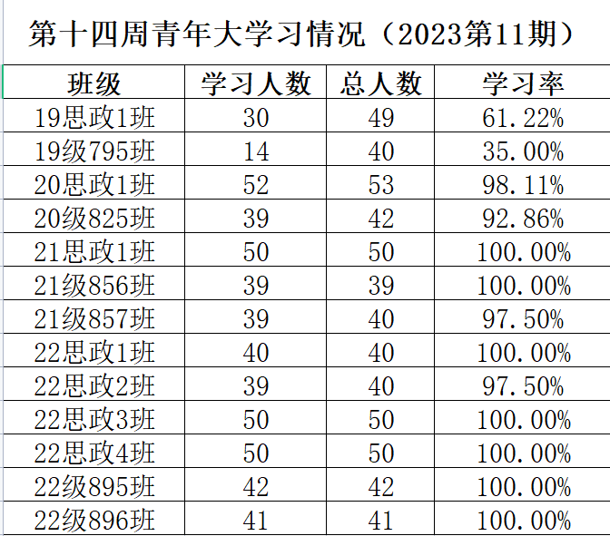 总结: 在本次青年大学习,20思政1班、21思政1班、21级856班、22思政1班、22思政2班、22思政3班、22思政4班、22级895班学习率达到了100%,在这里提出表扬;