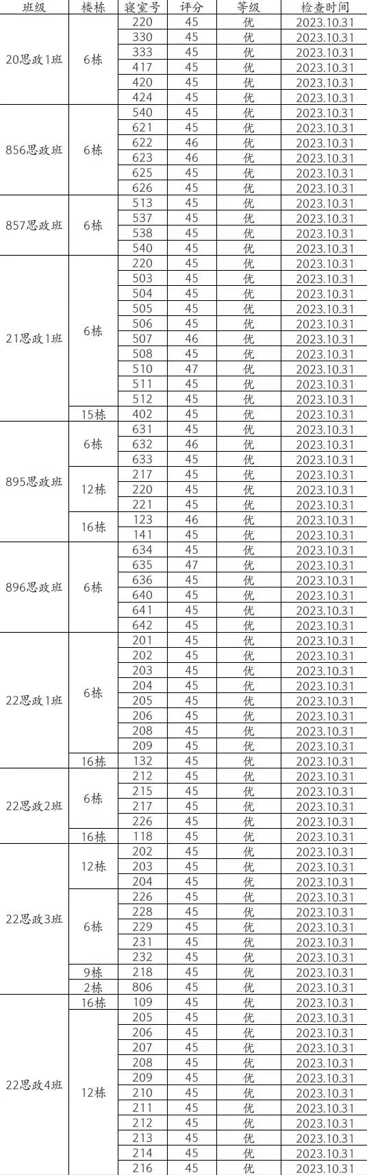 总结:本周卫生大检优寝比率较之前有所提高,总体表现中等。其中937思政班与23思政1班混寝16-615(杨程、李书畅、陈国颖、全启航)、23思政3班与23思政4班混寝16-439(唐慕逍、张耿荣、周顺翔、周家利)、856思政班6-627(刘书筠、邓利菲、李欣悦、郭斯颖)、857思政班6-539(吴牧宁、李菁、唐小蕾)、857思政班16-137(丁嘉豪、周靖浩、符灿宇、田畅轩)、857思政班16-139(胡佳骏)、896思政班6-639(雷丽萍、袁雅琴、杨雪琴、肖子怡)、936思政班16-619(李中翰、何泳先、陈龙云、陆琦)、23思政4班6-239(黄静仪、汪红玉、曾紫洋、唐琼玥)等宿舍仍需继续改进!希望大家共同努力,建设文明美丽公寓!