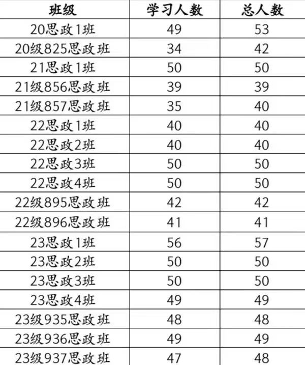 在本次青年大学习,21级856思政班,21思政1班,22思政1班,22思政2班,22思政3班,22思政4班,22级895思政班,22级896思政班,23思政2班,23思政3班,23思政4班,23级935思政班,23级936思政班学习率达到了100%,在这里提出表扬;