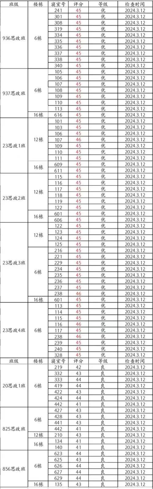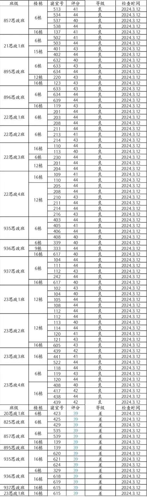 本周卫生检查情况较好,但20思政1班6-423(易薇、肖银、蔡馨怡、吴思云)、825思政班6-425(袁远凤、罗湘、彭莉君、石敬柳)与6-429(贺心瑶、胡依曼、胡颖芳、黄亚琪)、857思政班6-535(彭慧、蔡明琦、洪宇、龙琴)与5-539(吴牧宁、李菁、唐小蕾)等宿舍仍需继续改进!希望大家共同努力,建设文明美丽宿舍!