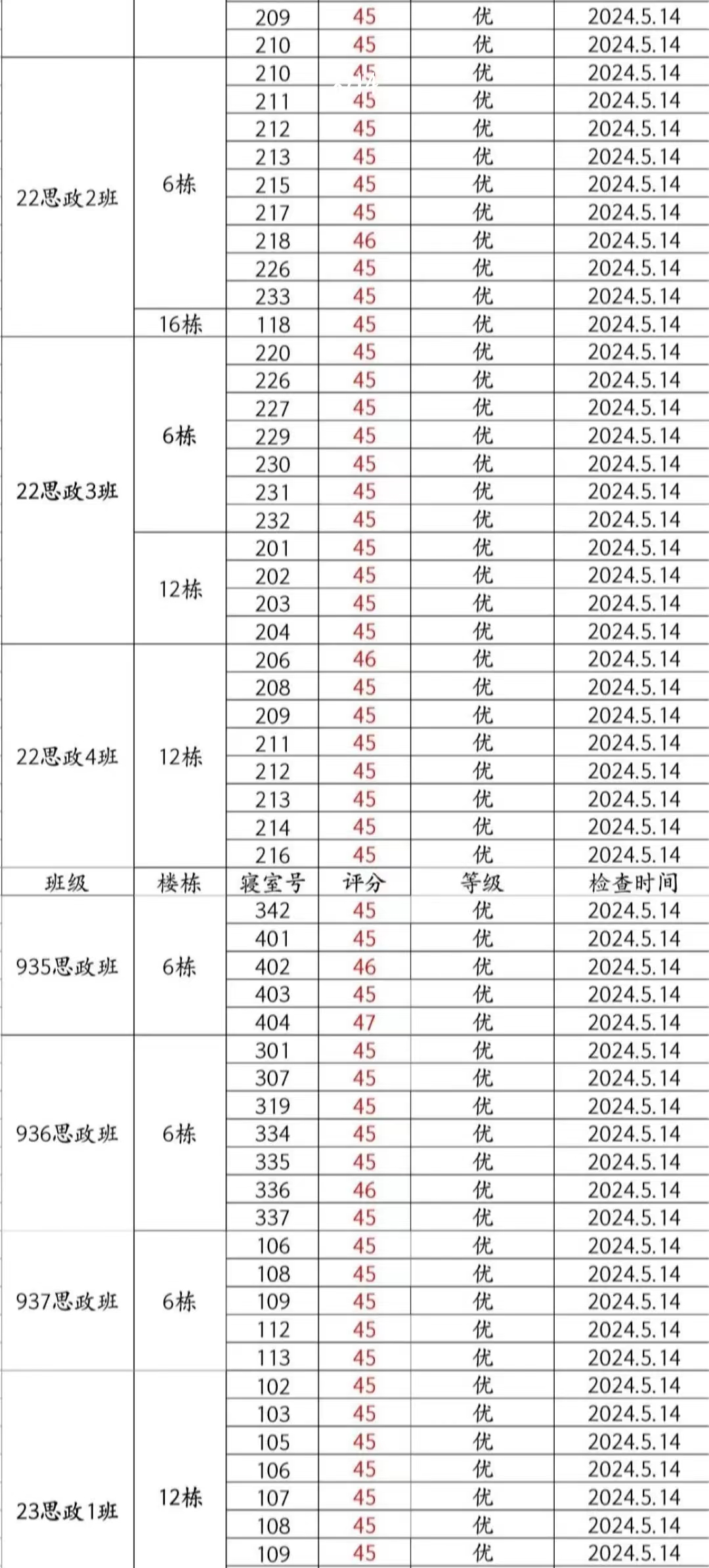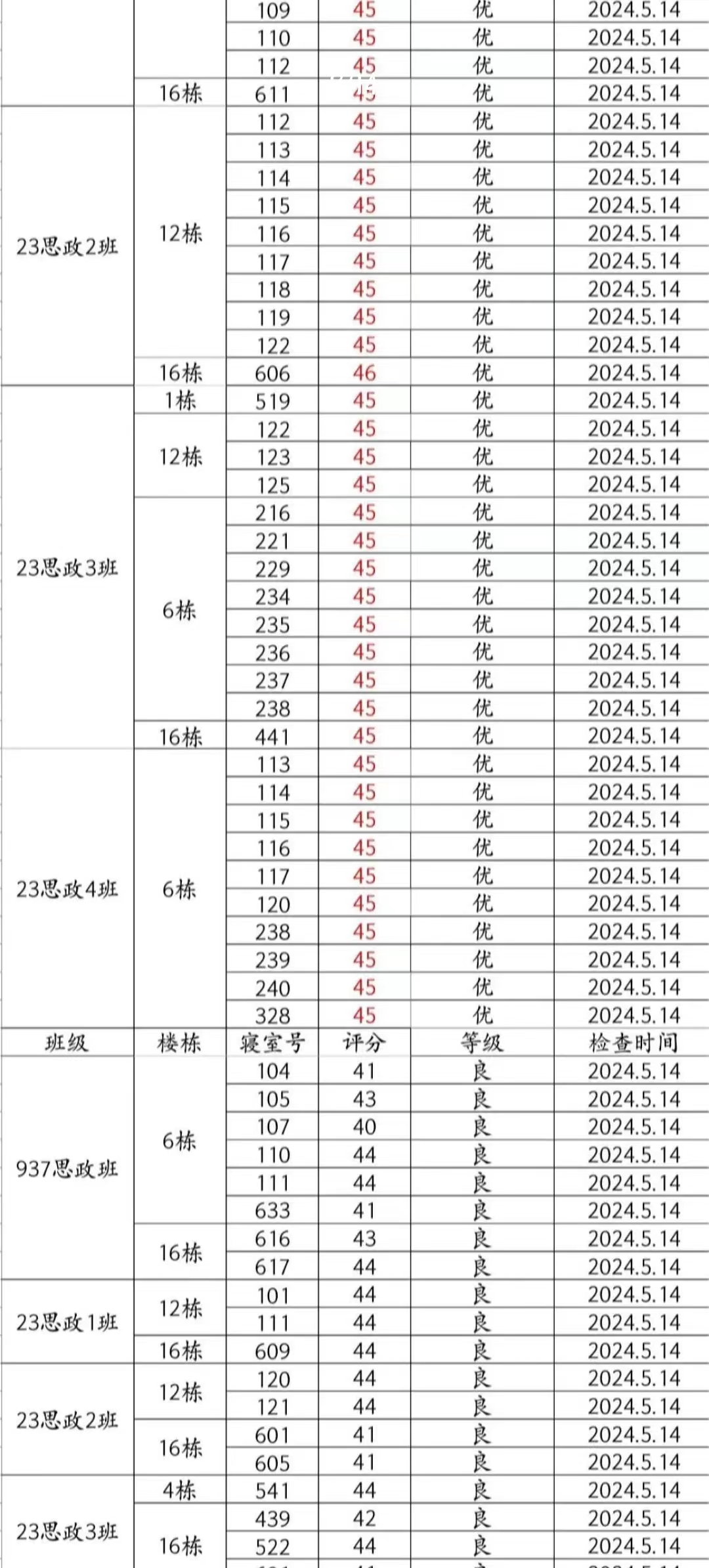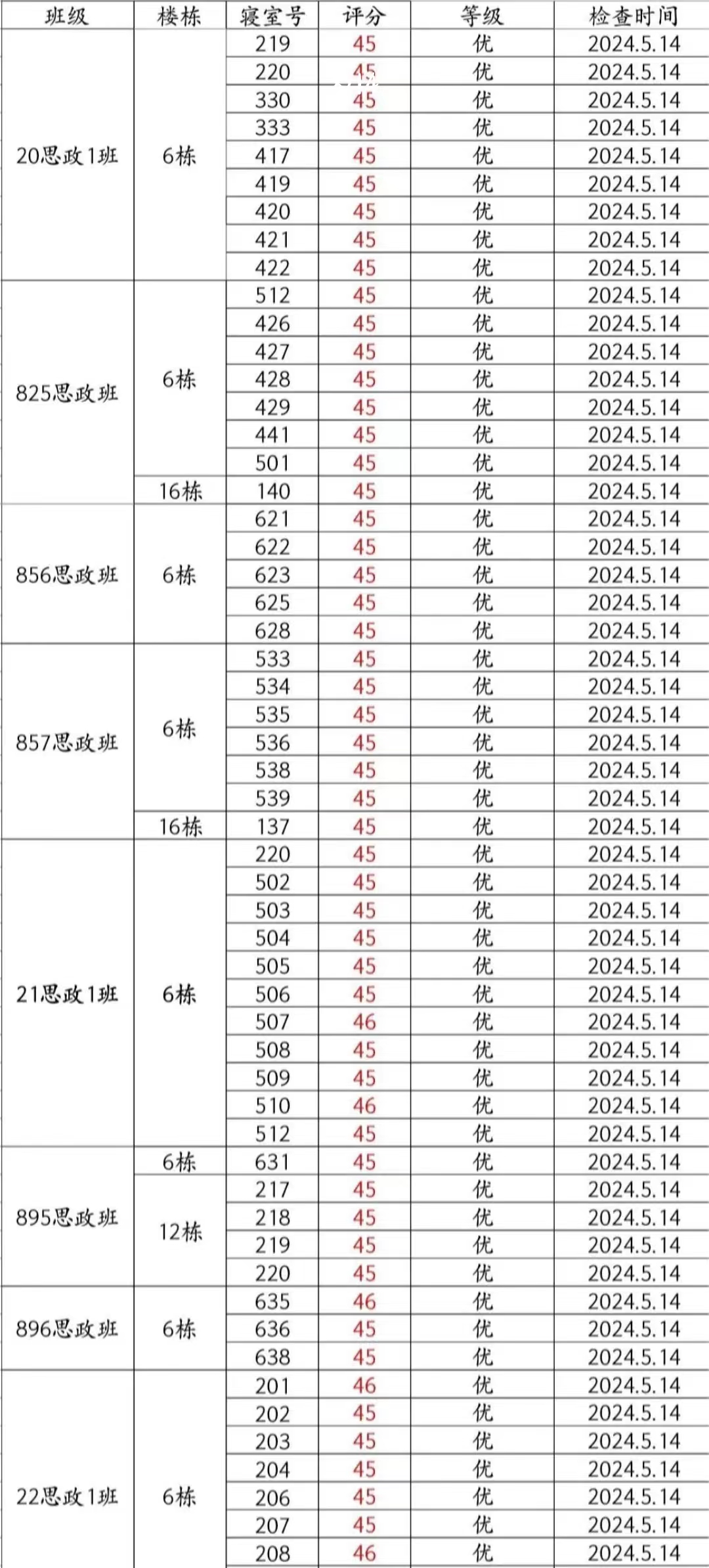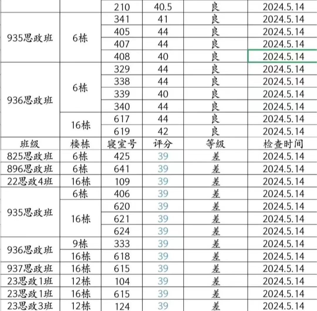 本周大检表现良好,但896思政班6-641(芦艺丹、陈萝玥、谭佳、雷奕林)、22思政4班16-109(朱连涛、胡子曜、李庚鸿、黄天翼)、935思政班6-406(刘瑛、蔡文静、林美平)、936思政班16-618(杨恩旭、刘锦洋、张汗泽、傅灏文)、937思政班16-615(陈国颖、全启航、李书畅、杨程)、23思政1班12-104(龚金沅、丁华娜苏、马孝同、张译予)等宿舍仍需继续努力。希望大家共同努力,建立文明美丽公寓!