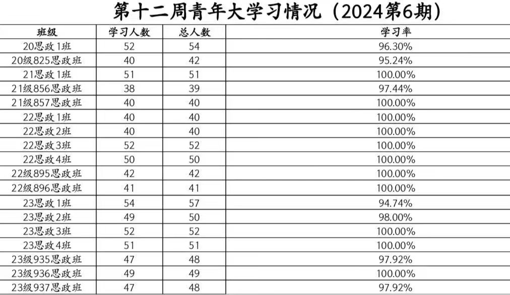 在本次青年大学习,21级857思政班、21思政1班、22思政1班、22思政2班、22思政3班、22思政4班、22级895思政班、22级896思政班、23思政3班、23思政4班和23级936思政班学习率达到了100%,在这里提出表扬;