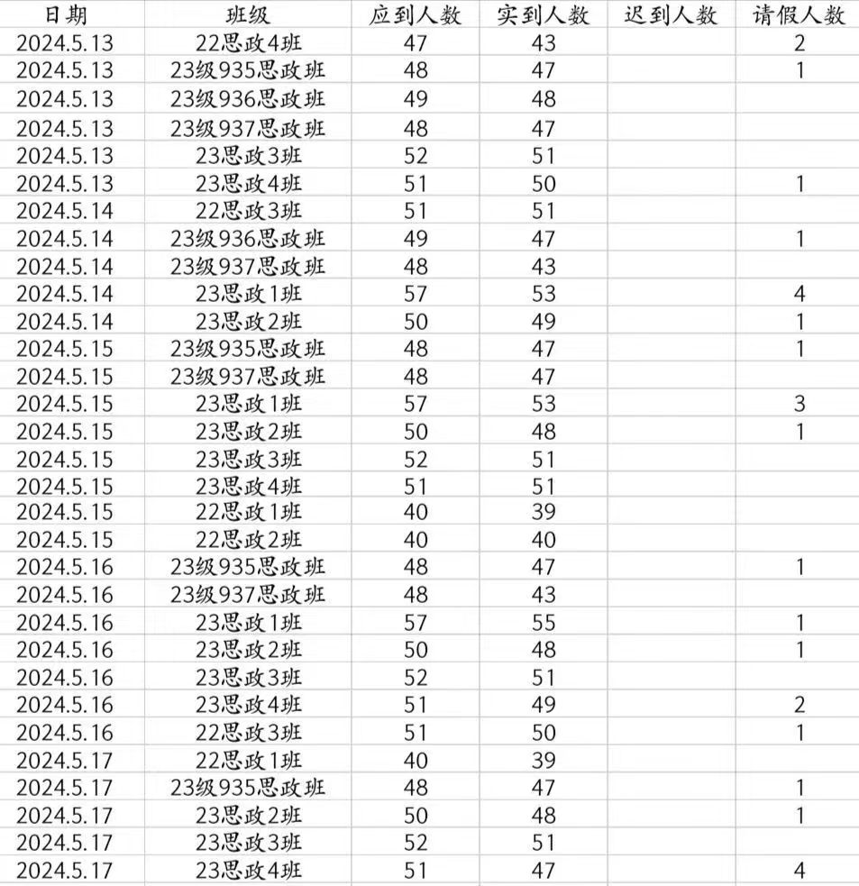 大部分同学表现良好,但仍存在极少部分同学缺席的情况:22思政4班35号张嘉琦、48号刘耘彤,望其他同学引以为戒。