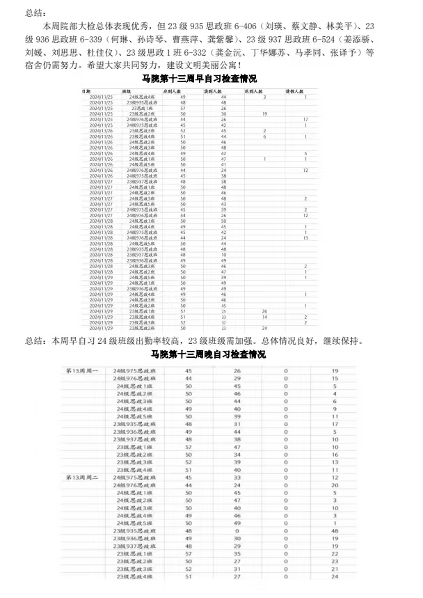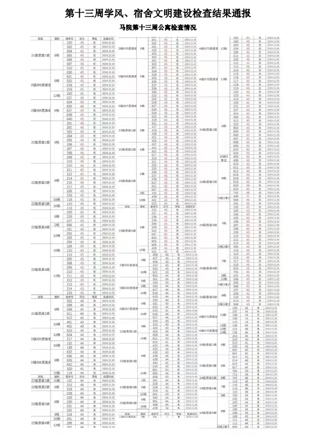 第十三周学风、宿舍文明建设检查结果