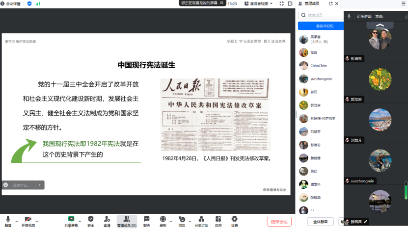 我院龙淼老师、徐声慧老师分别展示了“思想道德与法治”备课内容。龙淼主讲了“维护宪法权威”专题,从宪法的形成和发展,宪法的地位和基本原则,加强宪法的实施和监督三个部分进行了展示。徐声慧主讲了“自觉尊法学法守法用法”专题,展示了培养社会主义法治思维,依法行使权利与履行义务、如何提升法治素养三部分内容。在展示中,两位老师紧贴大学生实际,以案说法,以事说理,深入浅出,生动地诠释了专题内容。接着,老师们分别就展示内容进行了点评和讨论,充分肯定展示中的优点亮点,又对专题教学的改进提出了相关建议,分享个人的心得和经验。最后,我院老师与拉萨师专老师就少数民族与宗教信仰自由等问题展开了讨论。(一审:刘永红;二审:王竹苗;三审:阮东彪)