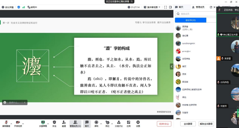 11月17日晚上,我院与拉萨高等师范专科学校思政部共同举行“思想道德与法治”线上集体备课。在主讲环节,滕茜茜老师、李红雁老师分别展示了备课内容。滕茜茜老师主讲道德实践专题,分别从社会公德、职业道德、家庭美德和个人道德做了详细展示,内容丰富,案例鲜活,紧贴社会实际。李红雁老师主讲社会主义法治专题,以案说法,深入浅出,生动地展示了法律的基本概念,法律的指定、执行等环节。在随后的点评环节,老师们对展示内容进行了热烈讨论,充分肯定了主讲老师展示的优点亮点,提出了相关建议,并总结自己在备课和教学中的心得和经验,充分发挥集体智慧,把专题内容打造得更加丰富更加精美。