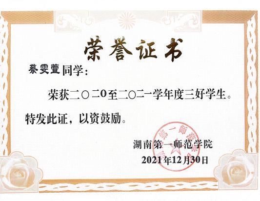 “路漫漫其修远兮,吾将上下而求索”。自2020年入学以来,蔡雯萱心中一直怀揣着明确的目标,在每学年的开始为自己设定不同任务,像闯关游戏一样,以“关关难过关关过”的态度,逐步突破每一层“关卡”,并且取得优异成绩。自律的态度、求知的渴望,使得蔡雯萱的学业成绩非常出色。连续四年综合测评位居专业第一,并荣获各类奖学金和“三好学生”等荣誉称号。在课业之余,她考取专业证书和其他技能证书,以完善自身知识体系;积极参加校内外各项竞赛活动,以提升个人综合素质。在勤勉致知中,她筑牢了扎实的专业根基,于无涯学海里刻苦钻研,孜孜不倦。